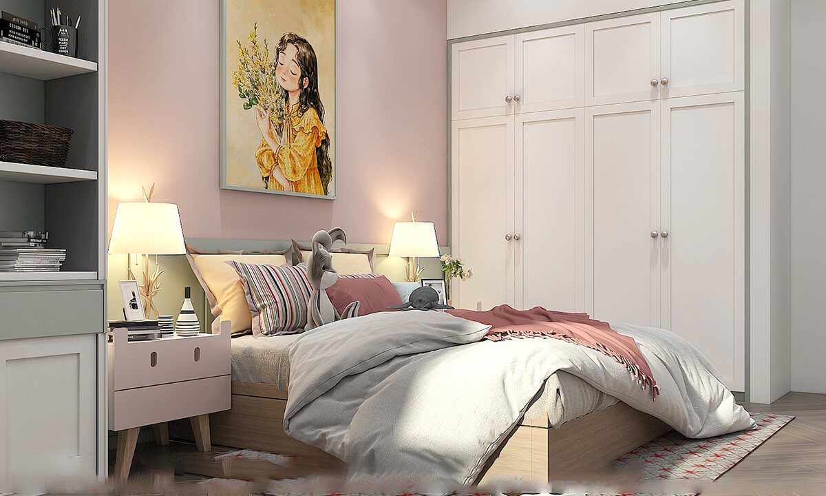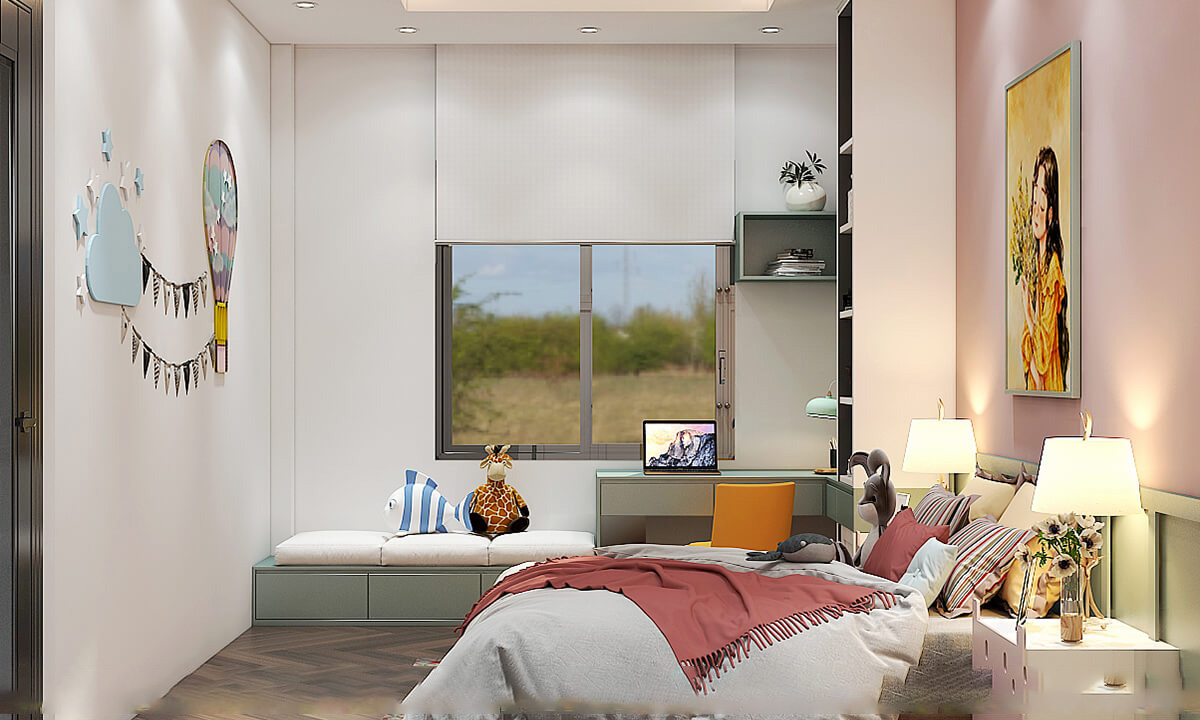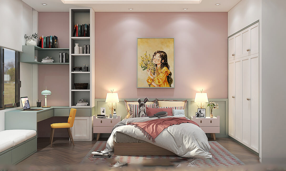 Phòng ngủ bé gái được bố trí thêm kệ để đồ tăng thêm không gian lưu trữ