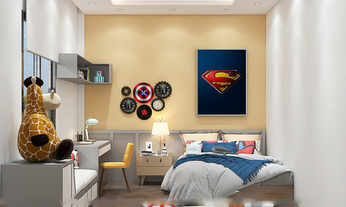 Phòng ngủ bé trai được kết hợp các màu sắc như xanh, đỏ, vàng một cách hợp lý