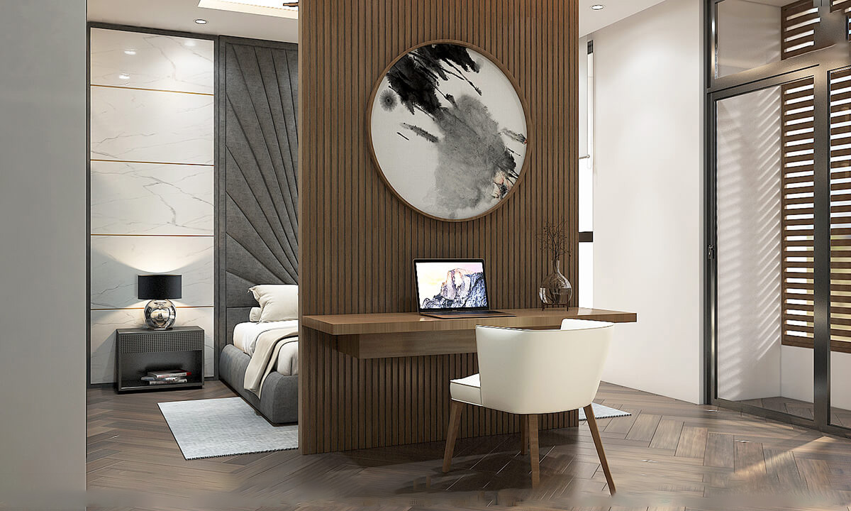 Bàn làm việc được bố trí sau vách ngăn đảm bảo không gian làm việc riêng tư