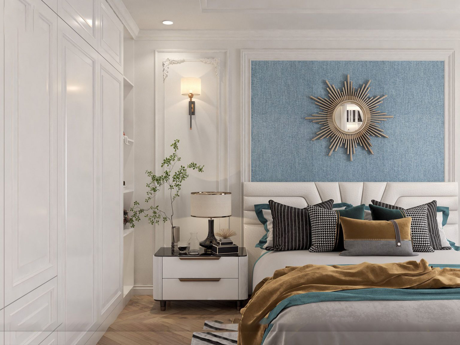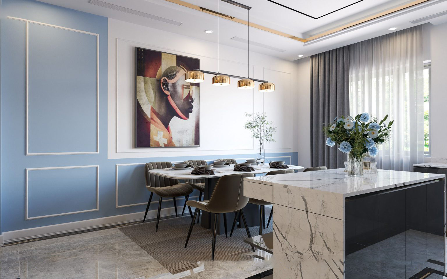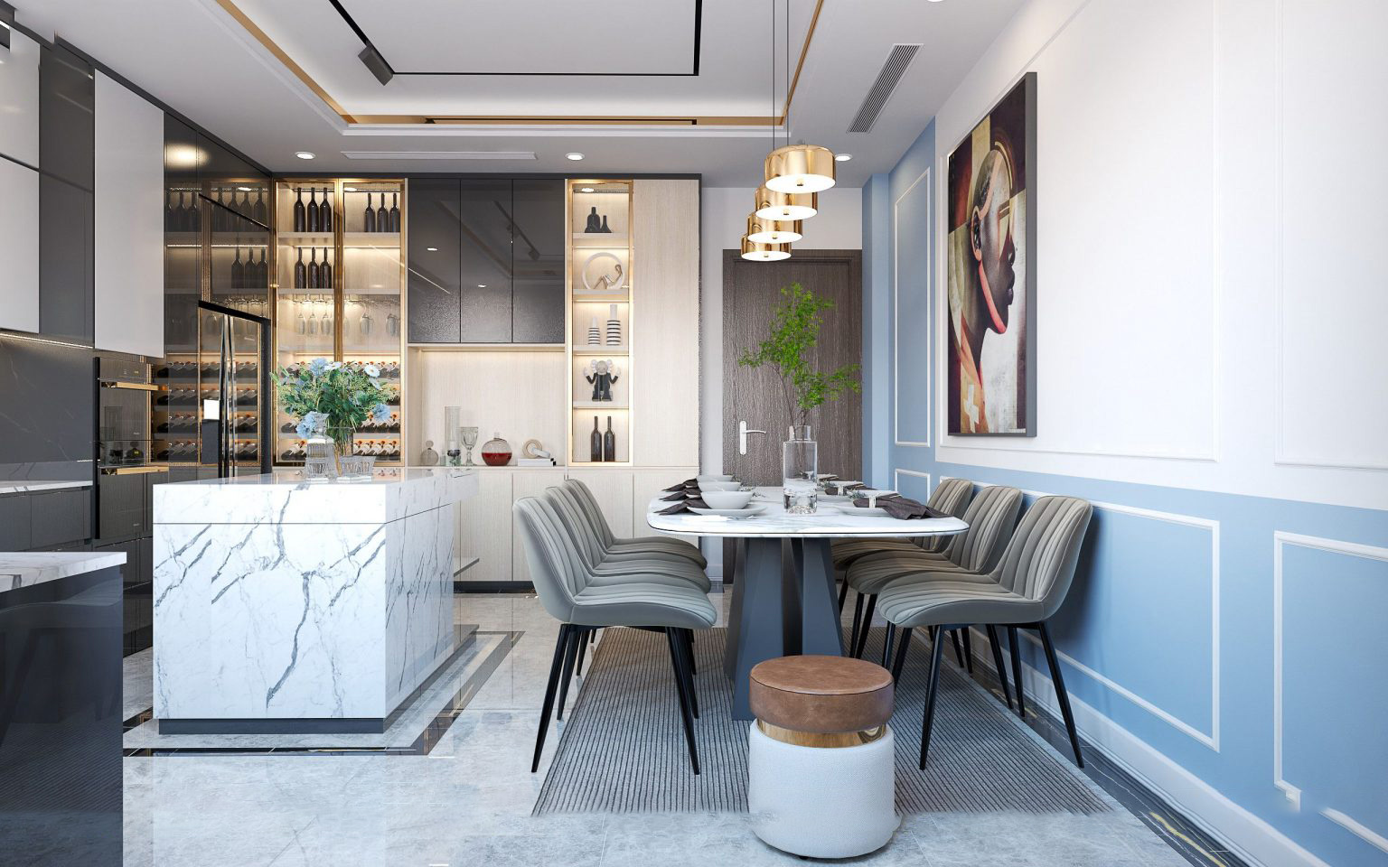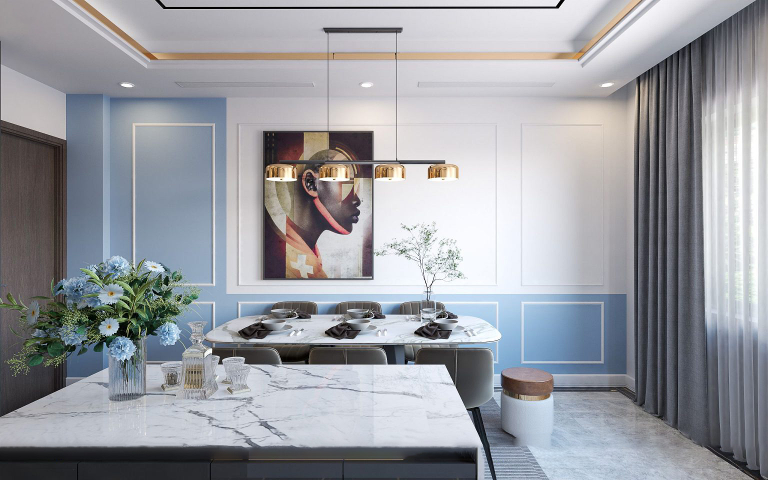 Sử dụng sắc xanh dương nhẹ nhàng kết hợp với sắc trắng tinh khôi làm chủ đạo, bản thiết kế nội thất của chị Anh tại tòa I4 Vinhomes Smart City mang lại cảm giác bình yên, thư thái và dễ chịu. Để không gian có thêm điểm nhấn tinh tế, tranh treo tường, lọ hoa được bày trí đảm bảo tính thống nhất trong toàn bộ tổng thể.27/04/2023 -