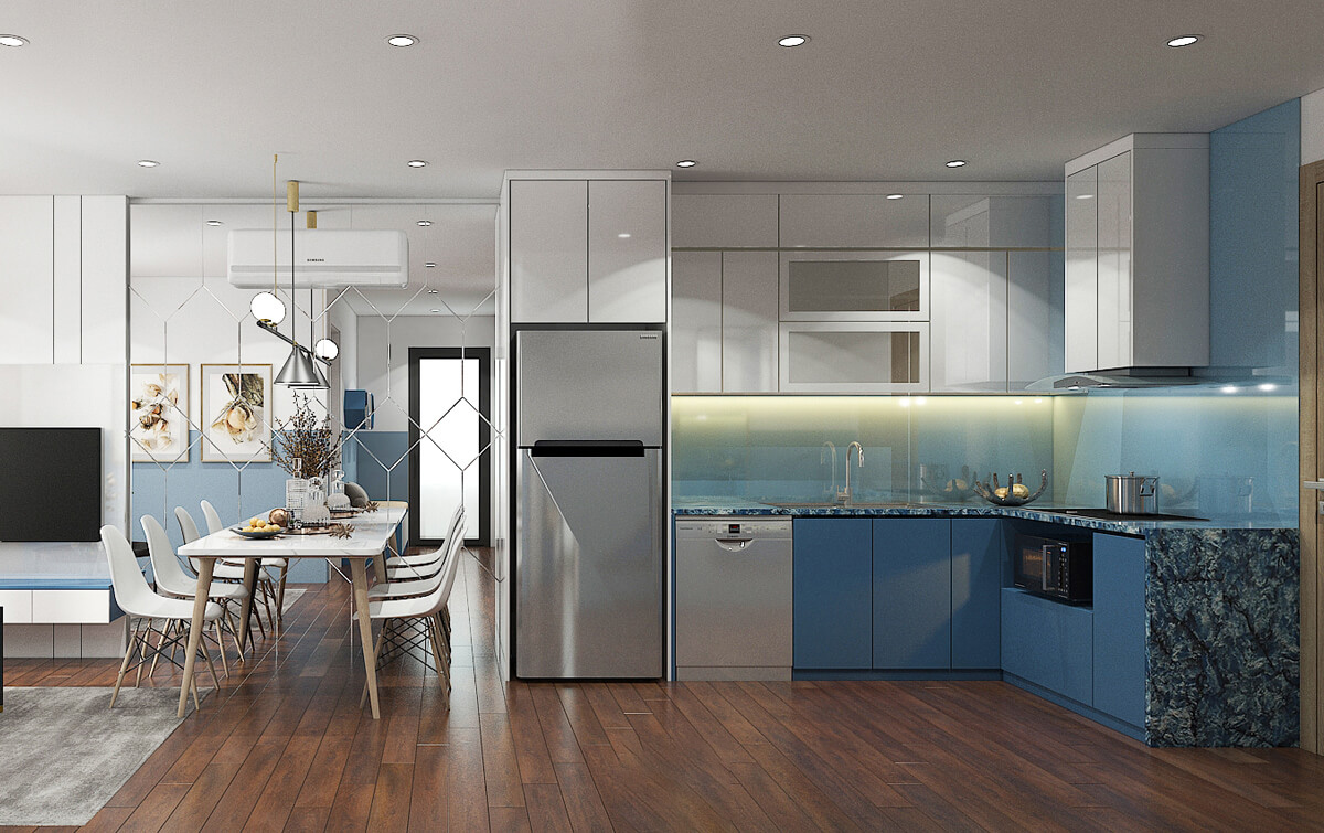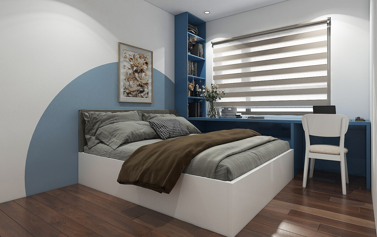 Sử dụng sắc xanh dương nhẹ nhàng kết hợp với sắc trắng tinh khôi làm chủ đạo, bản thiết kế nội thất của chị Anh tại tòa I4 Vinhomes Smart City mang lại cảm giác bình yên, thư thái và dễ chịu. Để không gian có thêm điểm nhấn tinh tế, tranh treo tường, lọ hoa được bày trí đảm bảo tính thống nhất trong toàn bộ tổng thể.