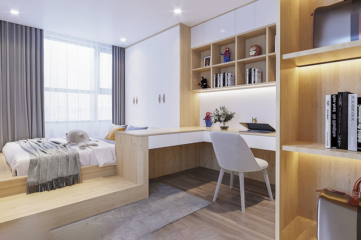 Hệ tủ quần áo và bàn học giúp tiết kiệm tối đa diện tích phòng ngủ