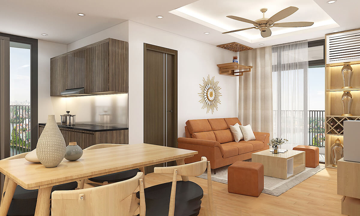 Không gian mở kết hợp bếp và phòng khách thông thoáng và ấm cúng