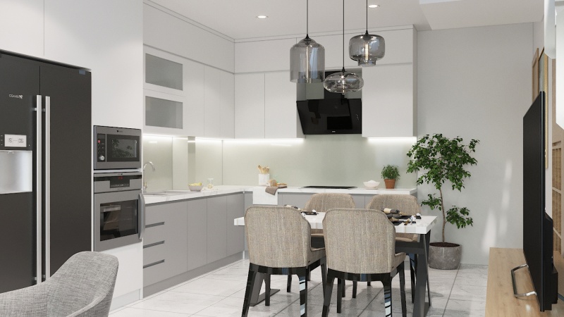 Để tiết kiệm diện tích không gian và tạo sự thoải mái trong quá trình sinh hoạt, thường bàn ăn sẽ được đặt chính giữa không gian nhà bếp. Vị trí này giúp chúng ta chuẩn bị bữa ăn một cách tiện lợi và nhanh chóng hơn.